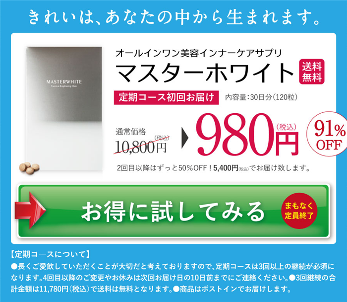 通常価格10,800円(税込)のマスターホワイトが定期コースなら初回は980円で購入できます!